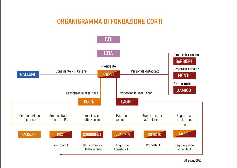 Fondazione Corti è stata creata nel 1993 per volere dei medici Piero e Lucille Corti con lo scopo di sostenere il St. Mary's Hospital Lacor, di Gulu, in Uganda, detto anche Lacor Hospital. L'Ospedale è stato fondato nel 1959 dai missionari Comboniani e si è trasformato, sotto la guida dei coniugi Corti, da piccolo centro sanitario a ospedale di riferimento per l’intera area del Nord Uganda. Con 554 letti, circa 200.000 pazienti all’anno, di cui circa 30.000 ricoveri, e 700 dipendenti, il Lacor Hospital oggi offre alla popolazione locale servizi di base e specialistici difficilmente reperibili altrove ed è uno dei maggiori centri di formazione per professionisti sanitari della regione; è sede di tirocinio per neolaureati e Polo della Facoltà di Medicina di Gulu.